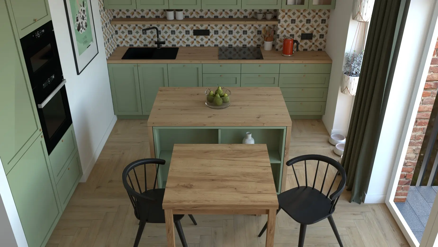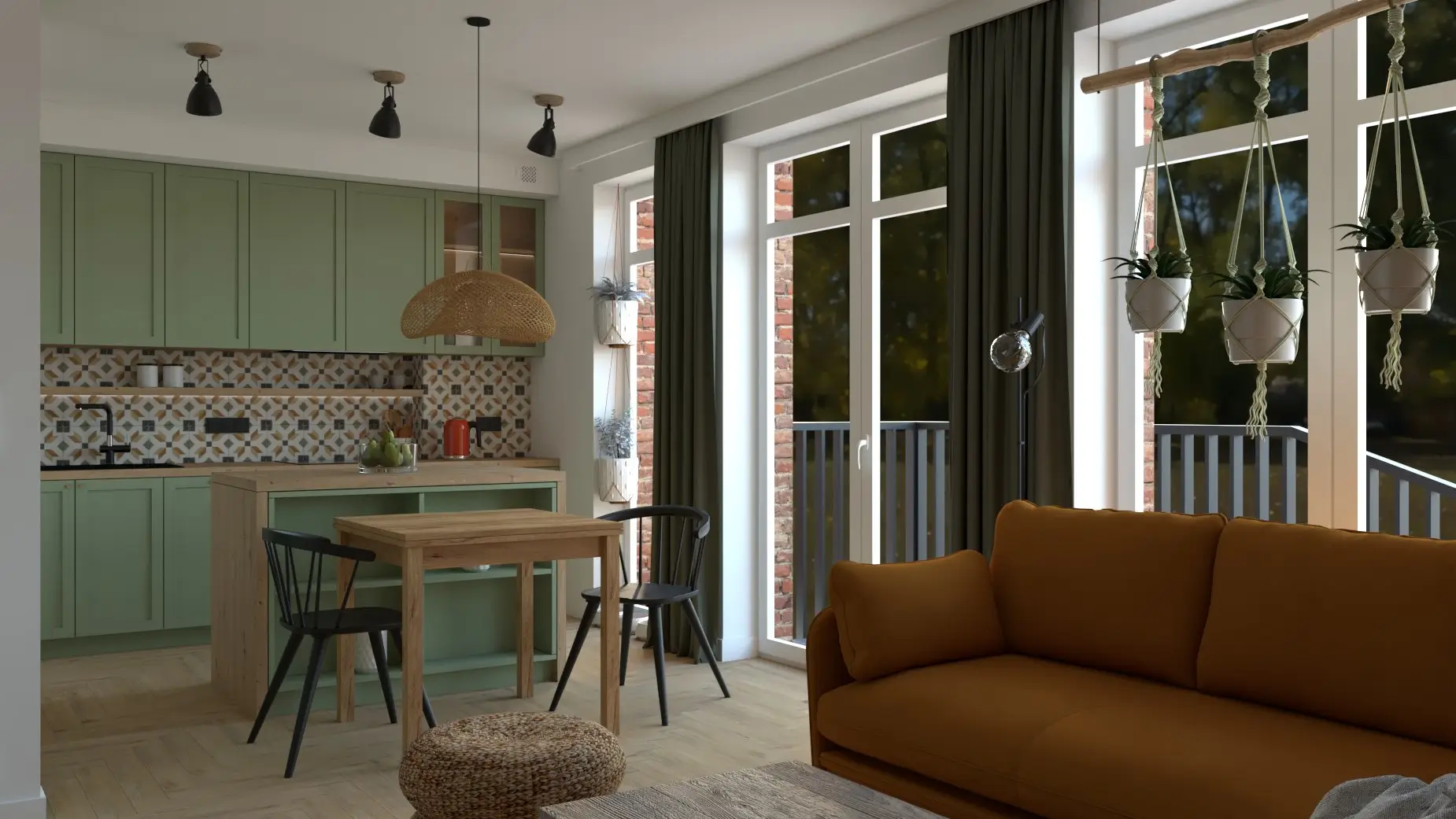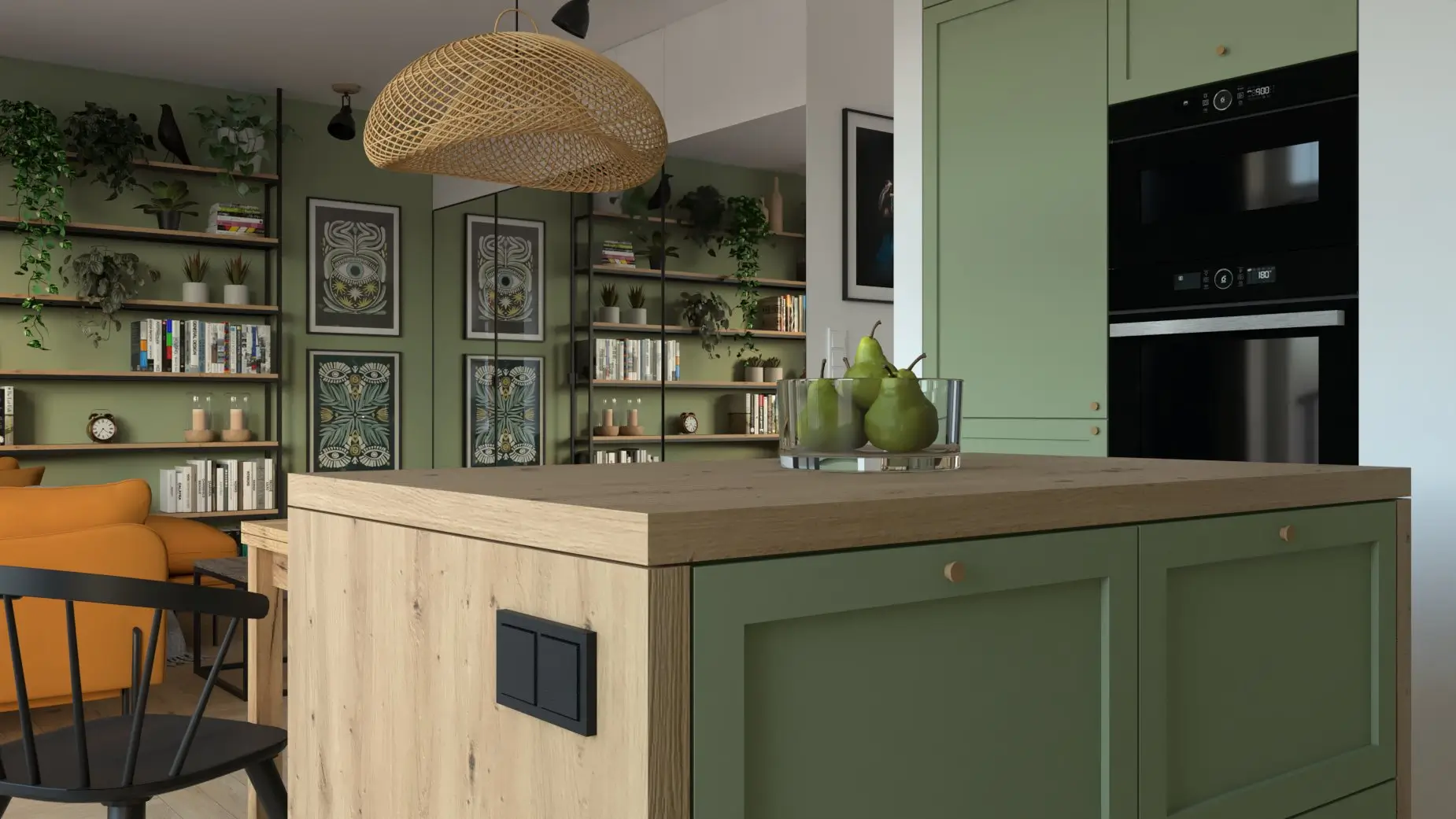 To wnętrze emanuje dobrą energią — od oliwkowych frontów i wzorzystych płytek po musztardową sofę, która staje się sercem salonu. Drewno i zieleń tworzą przytulny, domowy klimat, a przemyślane oświetlenie i detale w naturalnych odcieniach dodają wnętrzu głębi.