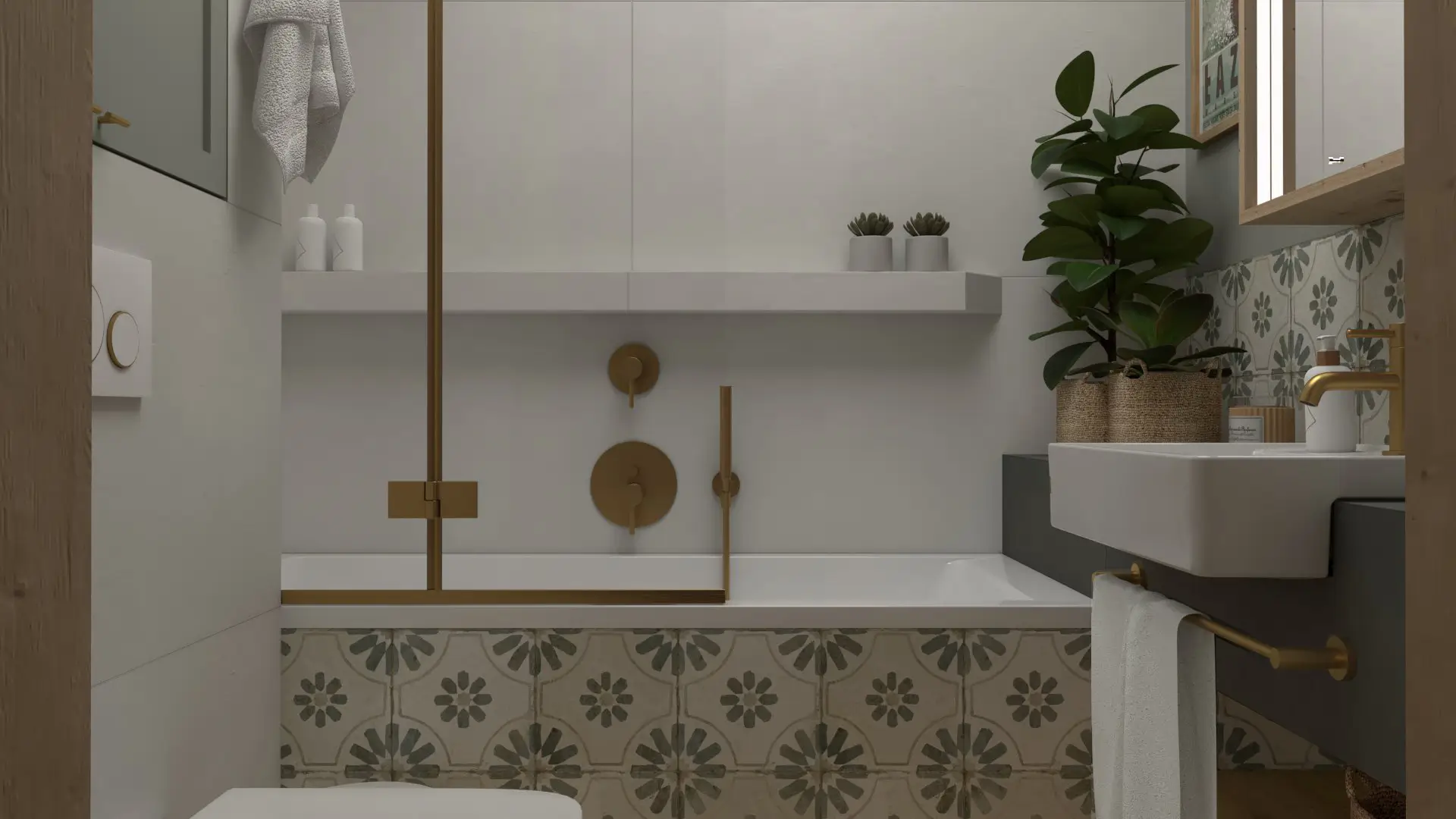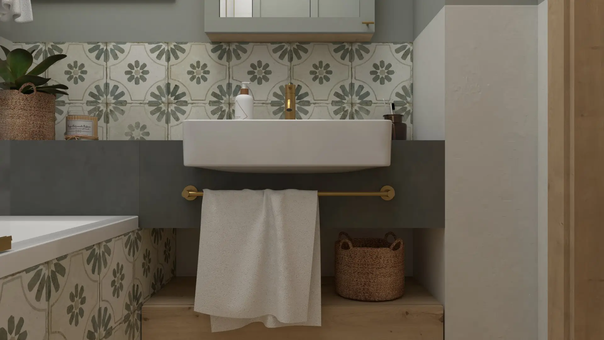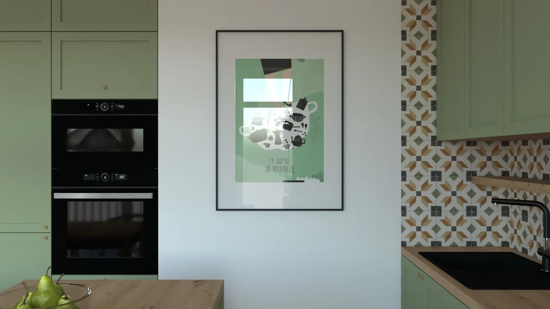 To wnętrze emanuje dobrą energią — od oliwkowych frontów i wzorzystych płytek po musztardową sofę, która staje się sercem salonu. Drewno i zieleń tworzą przytulny, domowy klimat, a przemyślane oświetlenie i detale w naturalnych odcieniach dodają wnętrzu głębi.