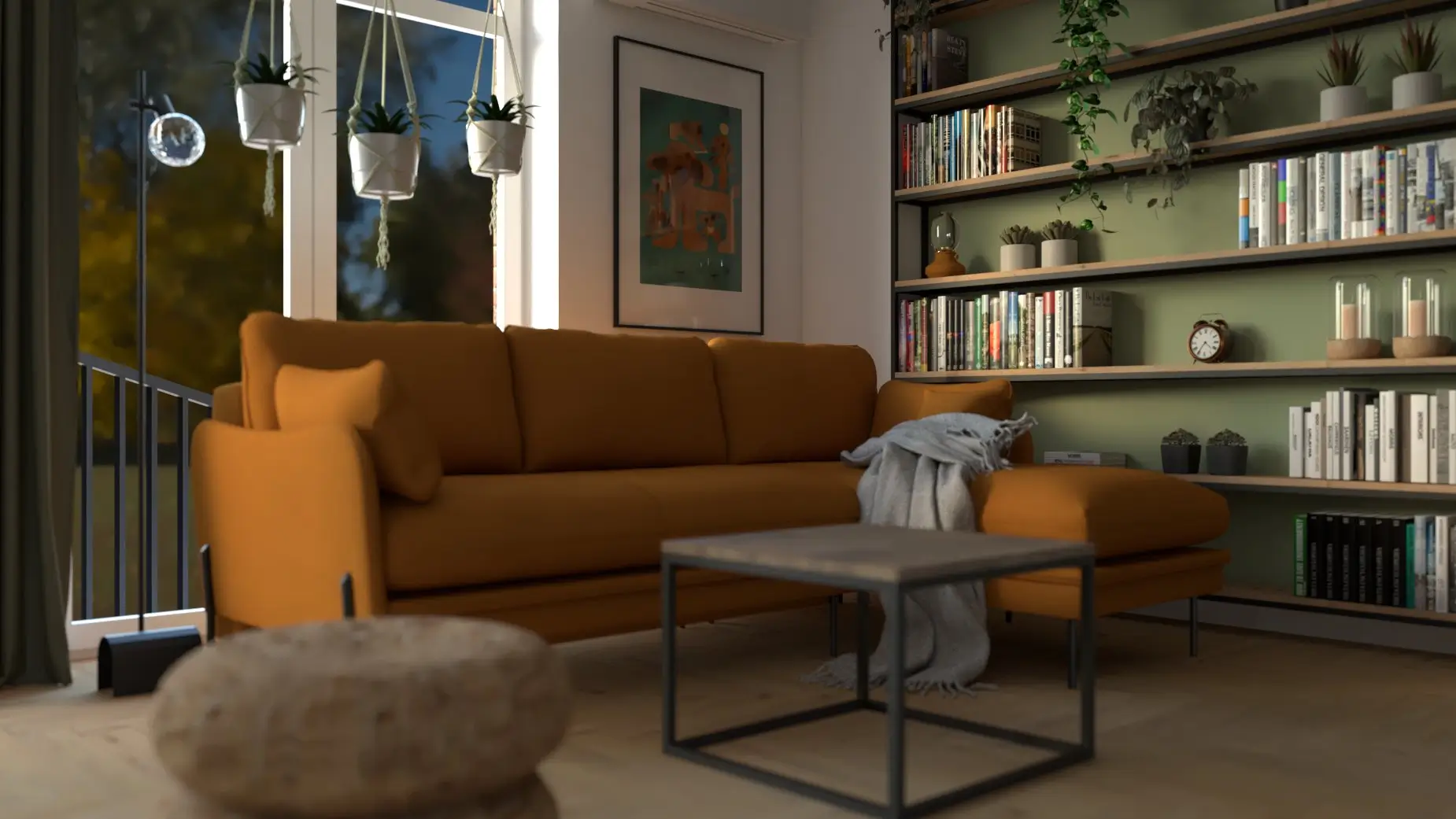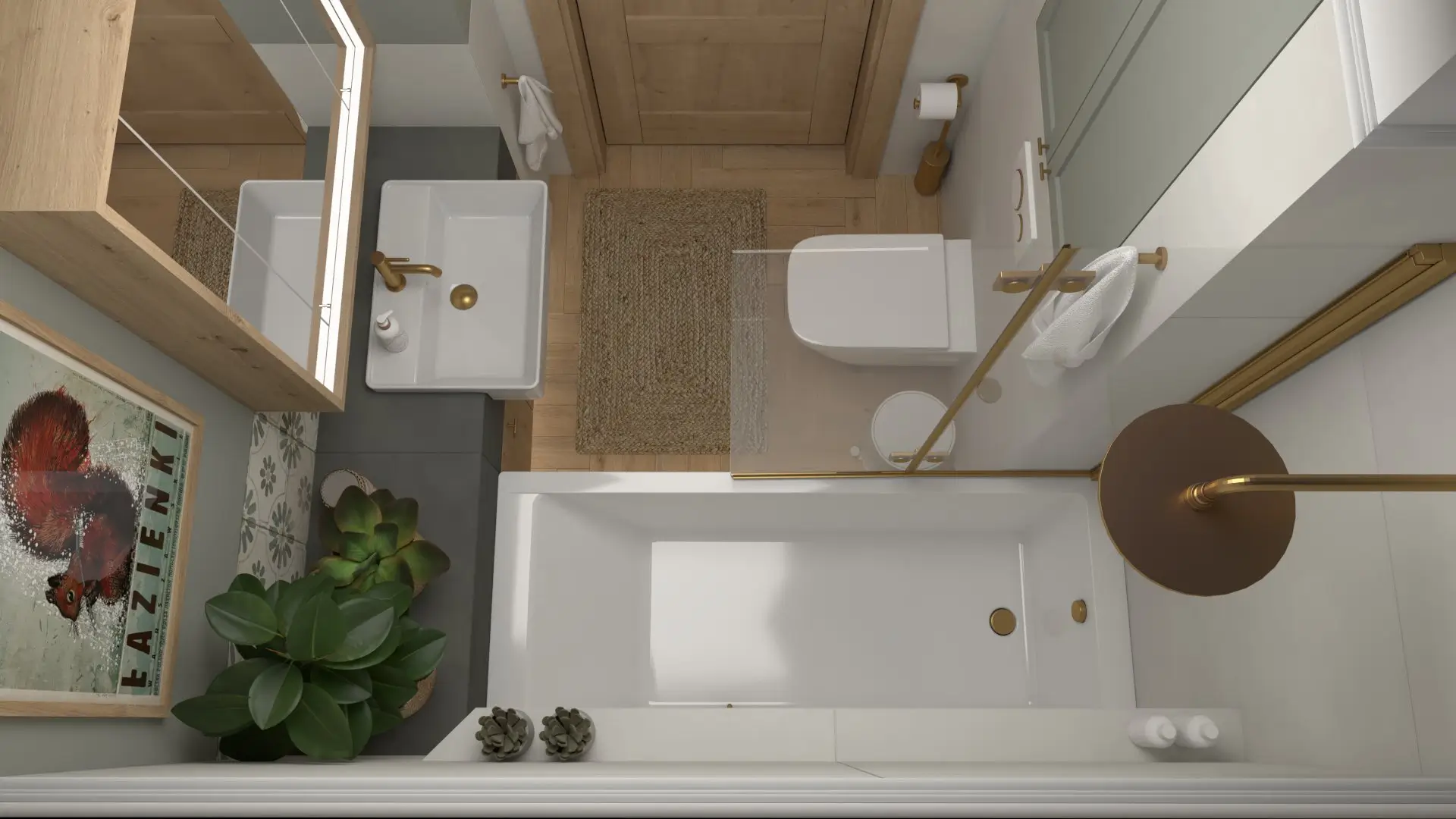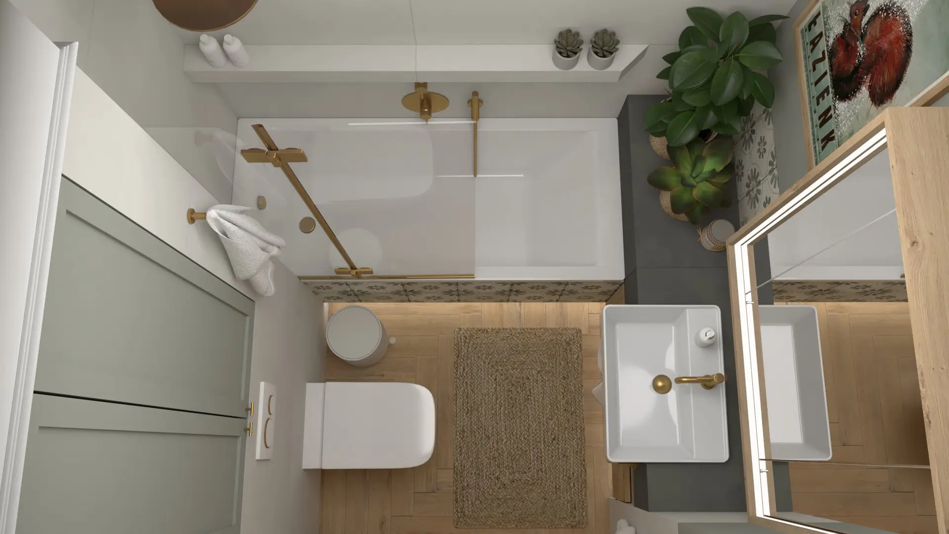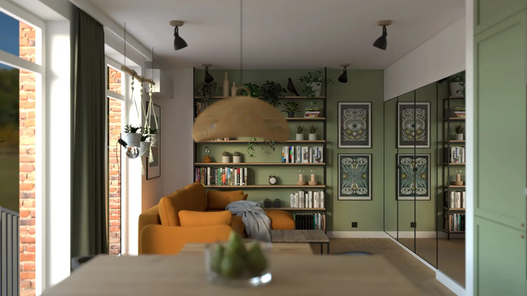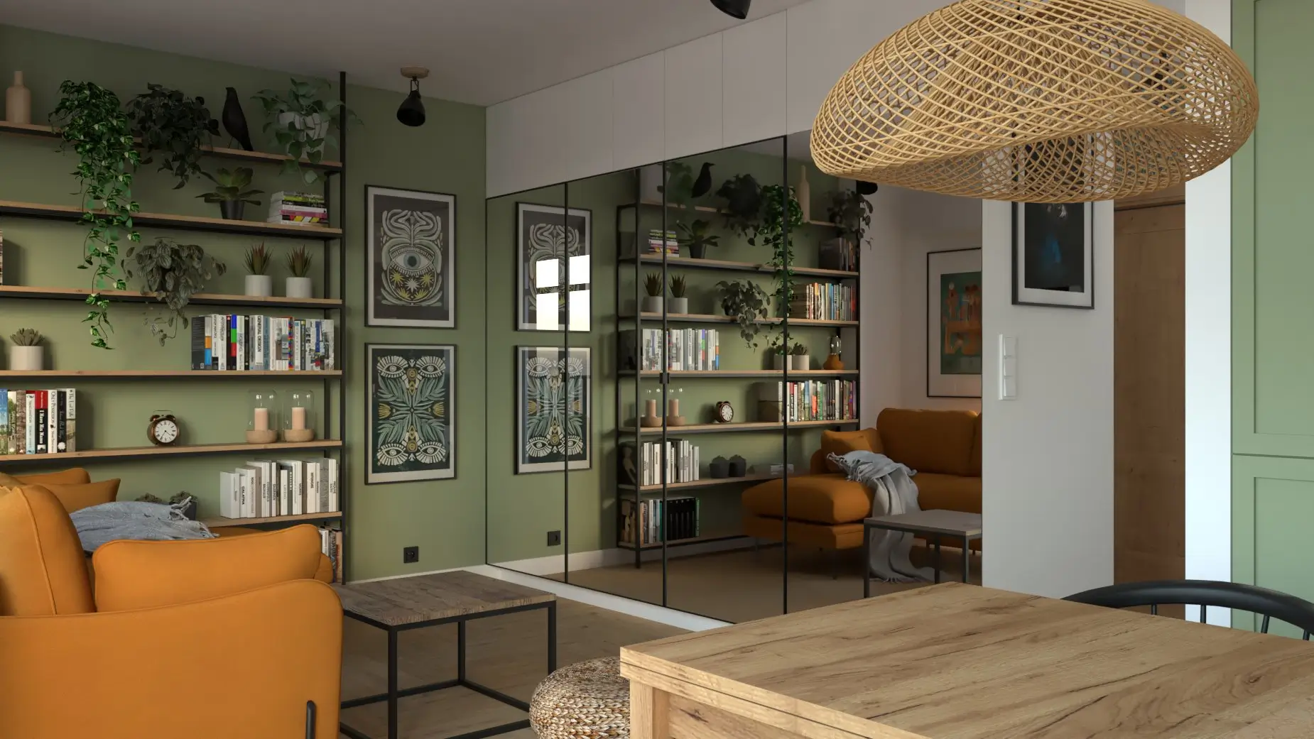 Każdy element został zaprojektowany z myślą o komforcie i funkcjonalności: praktyczna kuchnia, przytulny salon z biblioteczką, łazienka z charakterem. Całość łączy świeżość, natura i codzienna wygoda — wszystko w harmonii i z odrobiną artystycznego luzu.