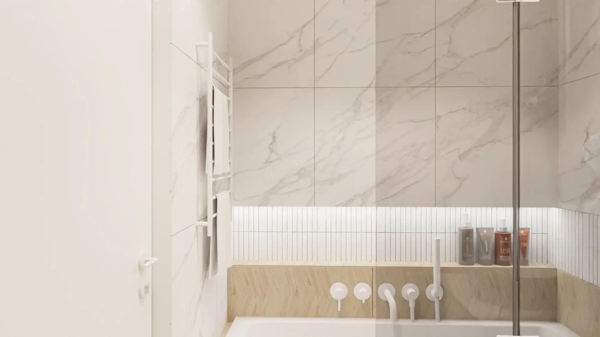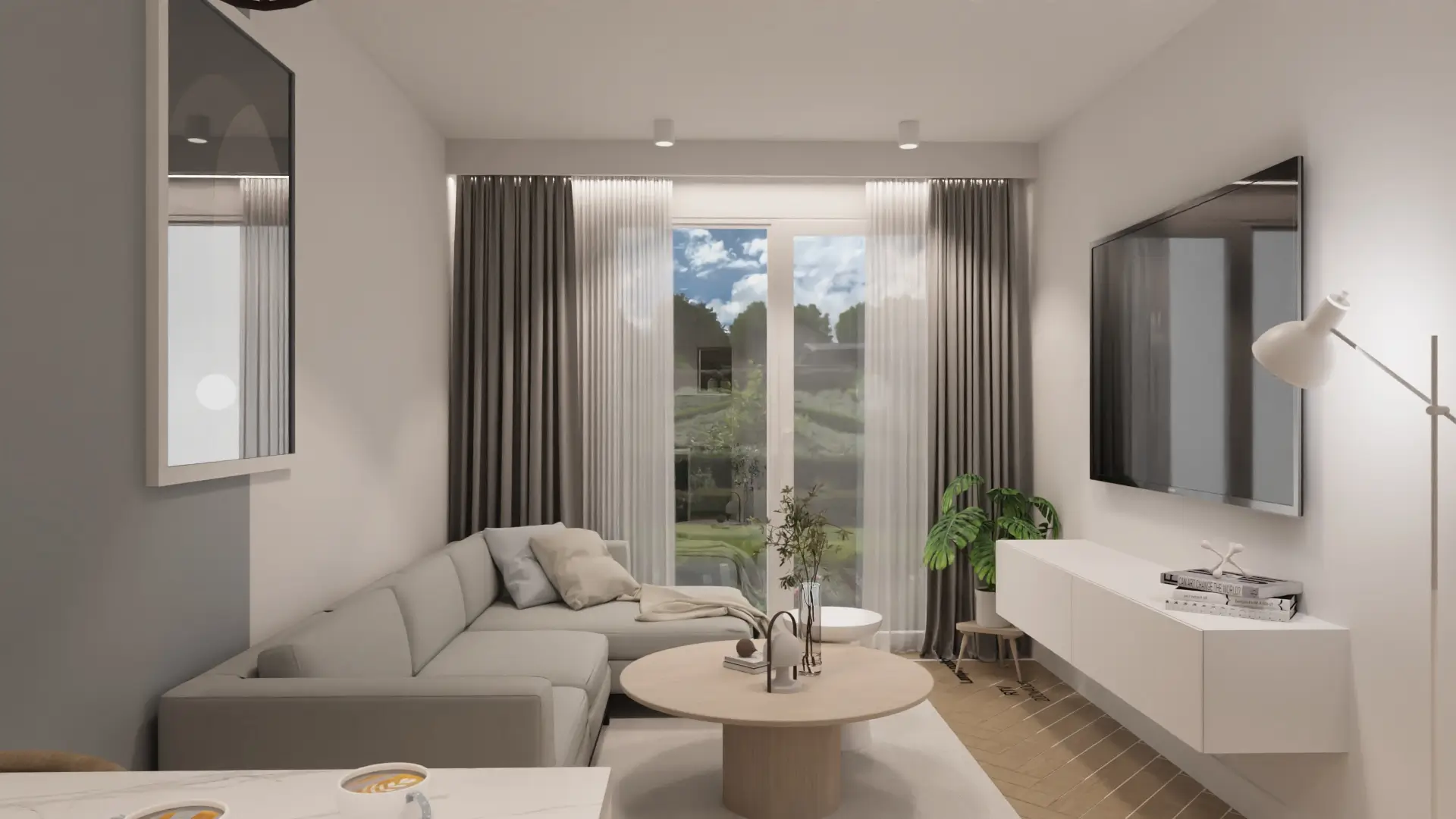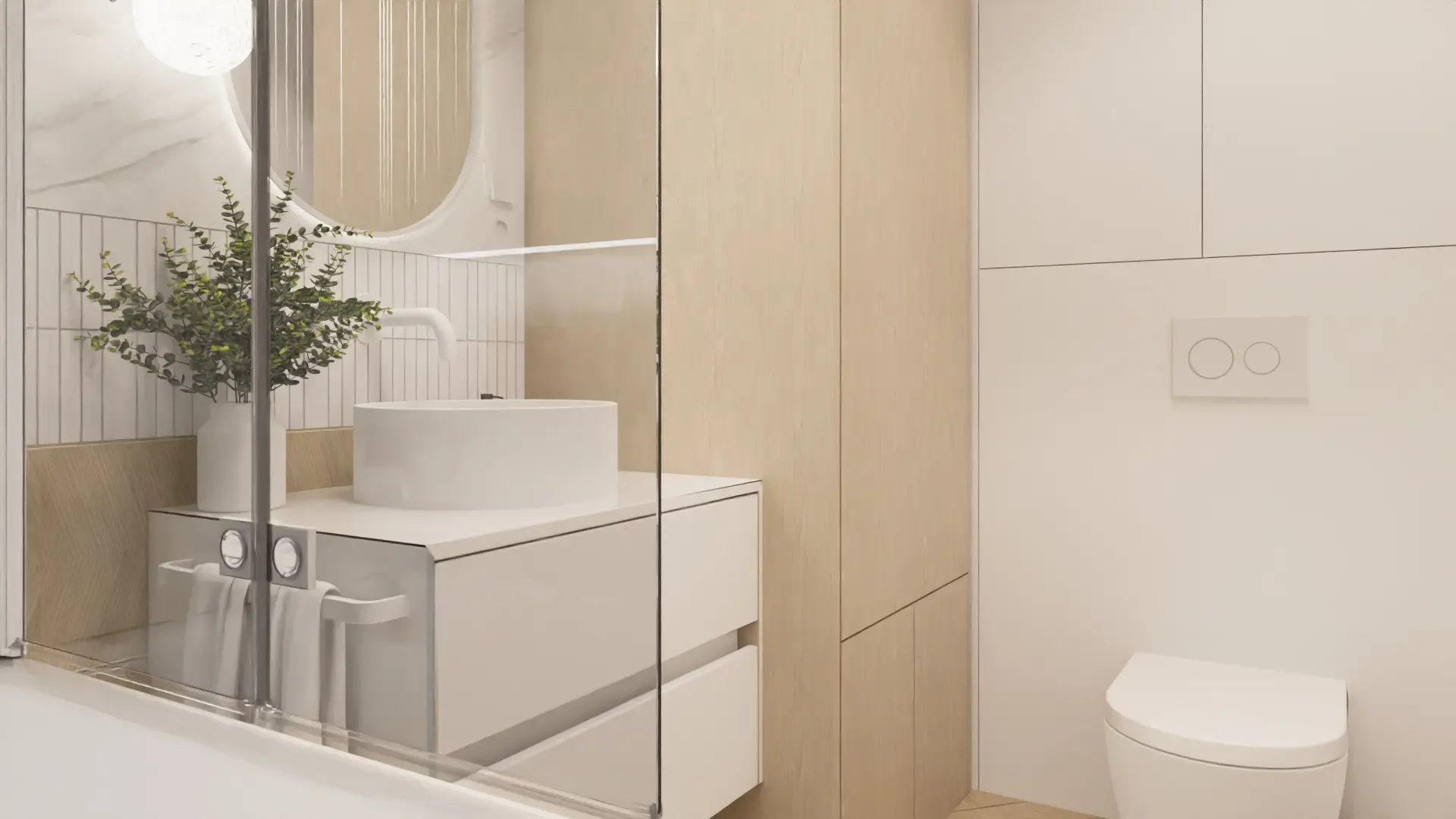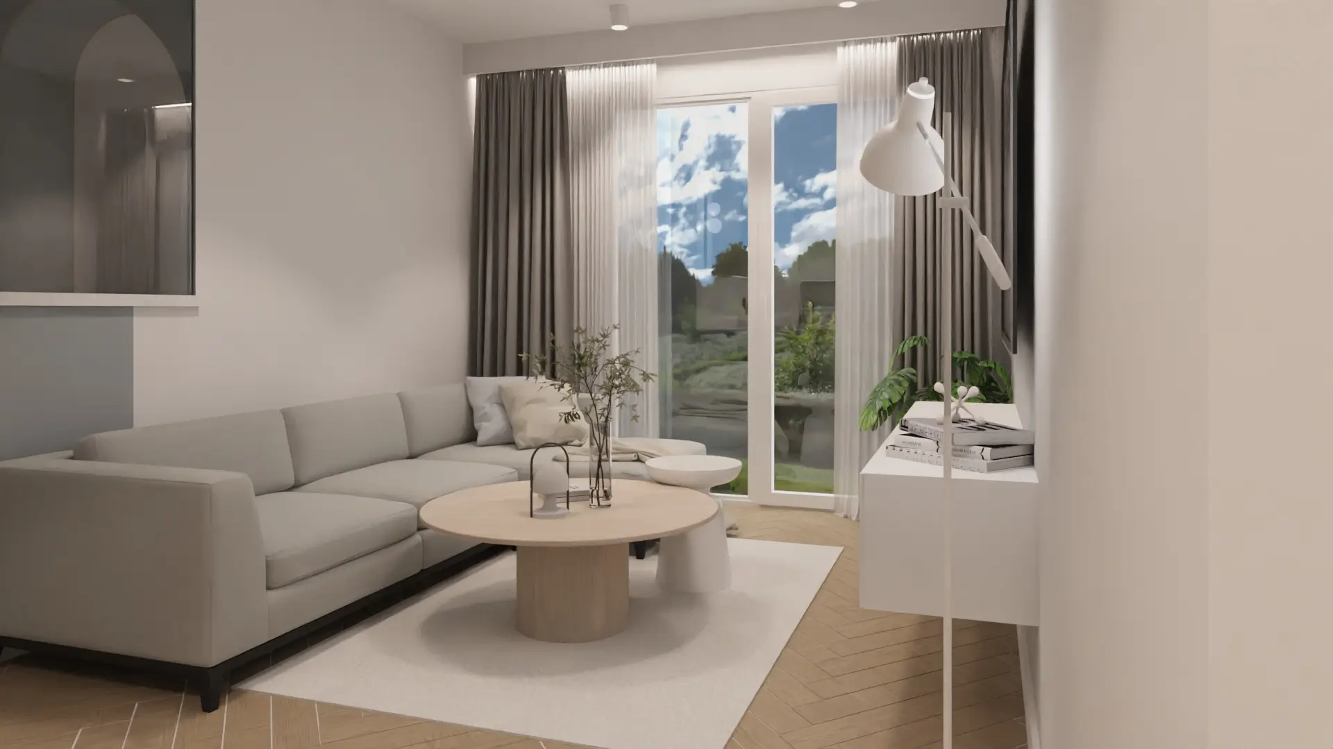 To wnętrze łączy w sobie nowoczesną prostotę i miękkość naturalnych materiałów. Dominują tu jasne beże, ciepłe drewno i delikatne szarości, które tworzą przestrzeń pełną harmonii i światła.