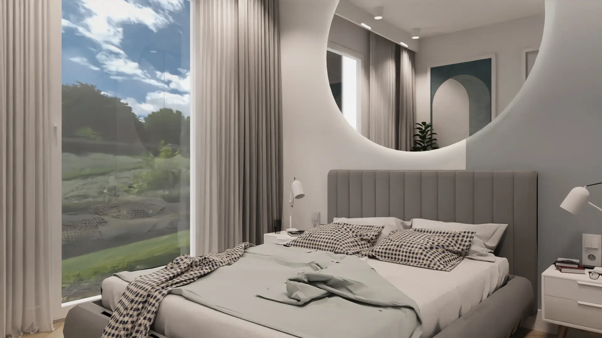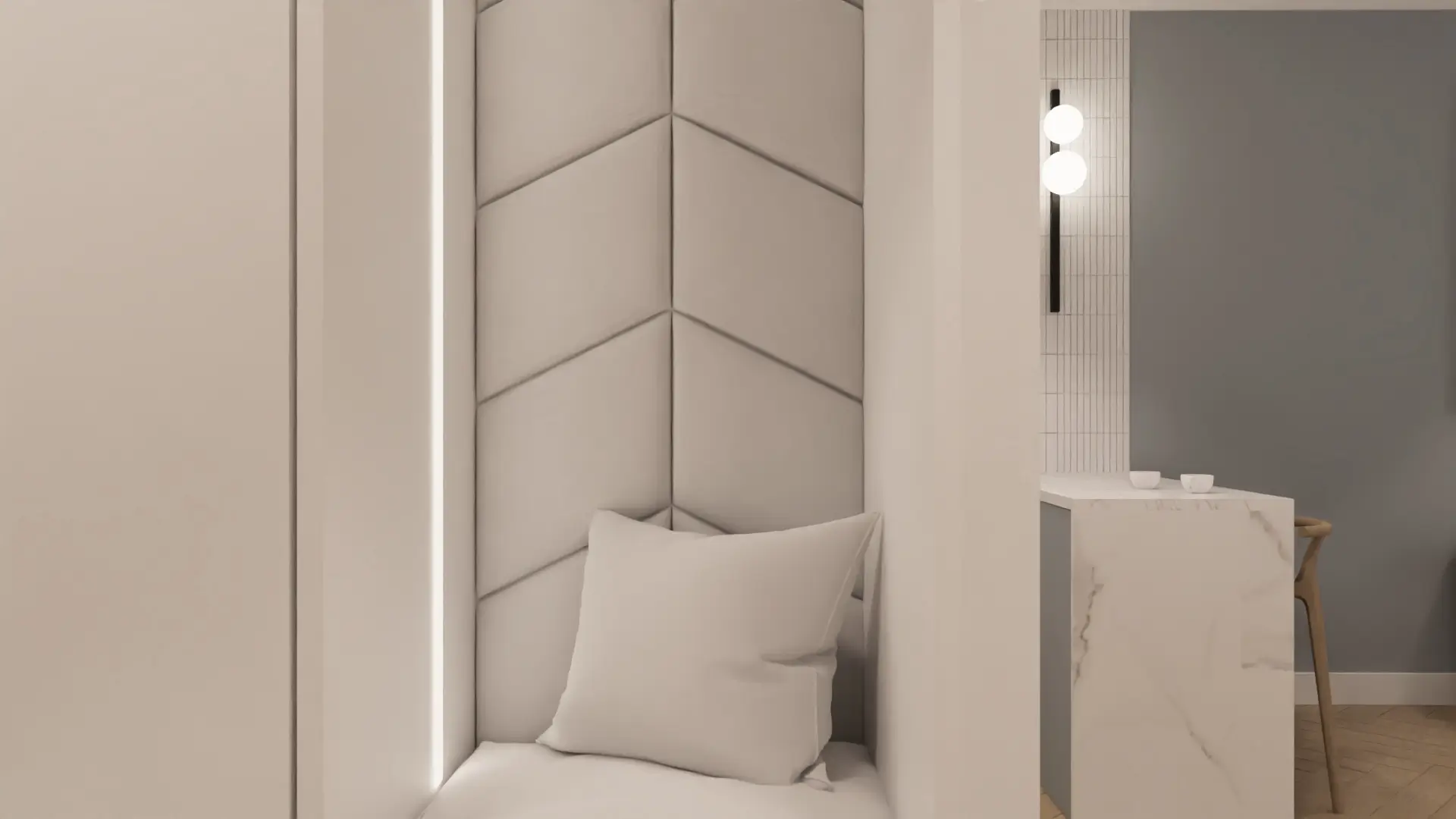 Subtelne oświetlenie, miękkie tkaniny i obłe formy nadają wnętrzu przyjemny rytm, a konsekwentna kolorystyka sprawia, że każde pomieszczenie płynnie przechodzi w kolejne.