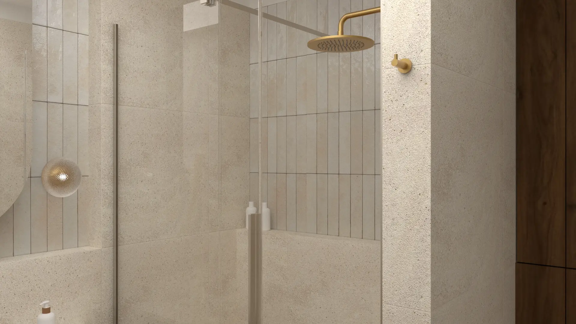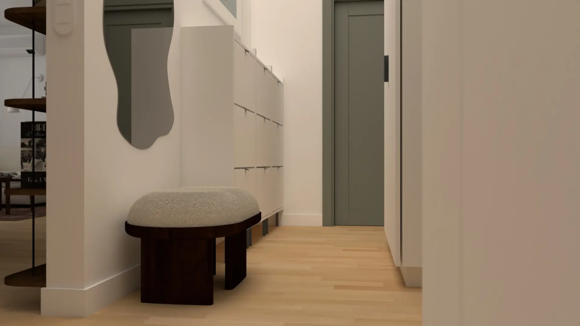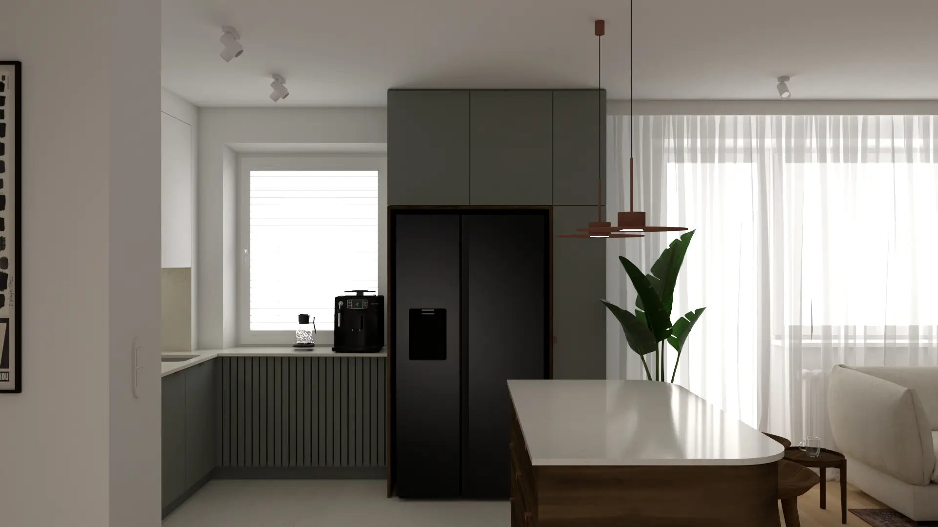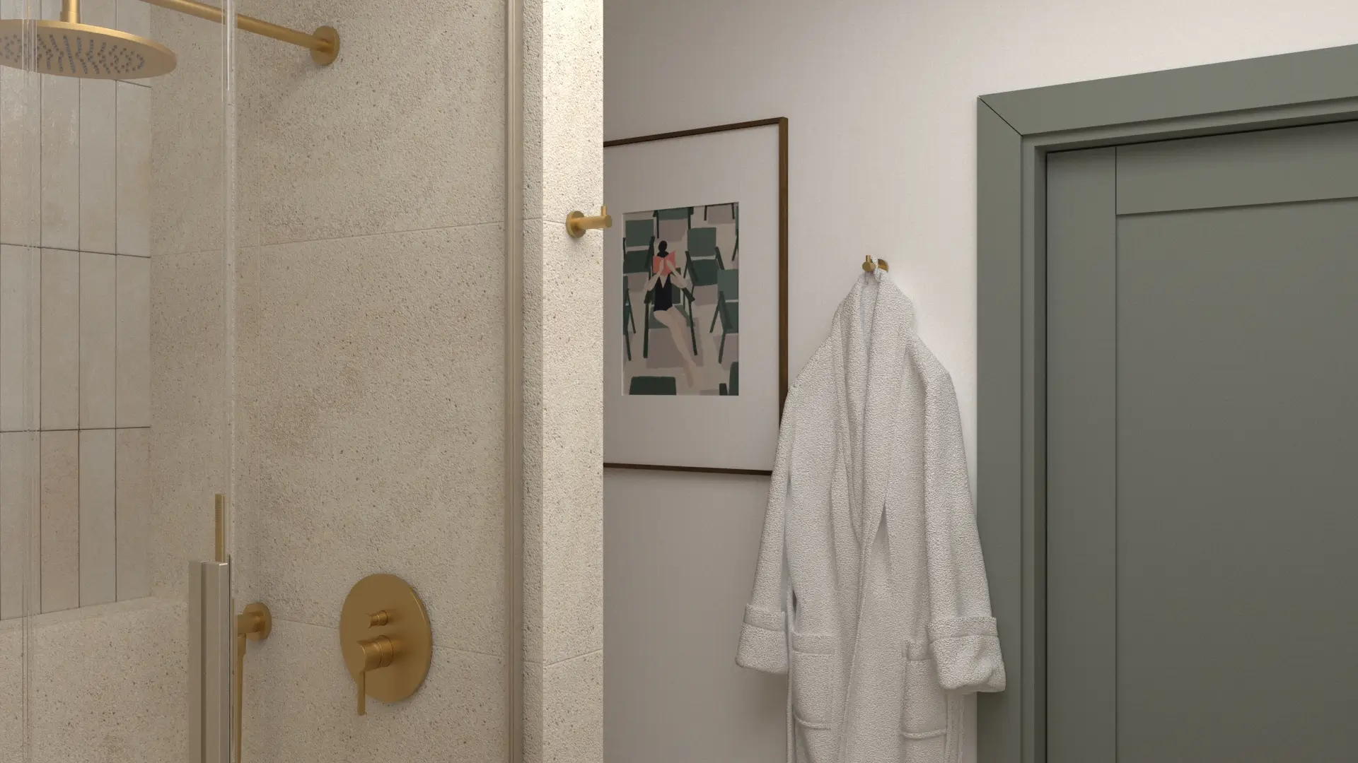 To wnętrze to połączenie stonowanych beży, oliwkowych drzwi i głębokiego orzecha, które razem tworzą harmonijną, przytulną przestrzeń. Prosty układ, miękkie tkaniny i naturalne światło budują domową atmosferę, a detale w kolorze złota nadają całości subtelnego wyrafinowania.