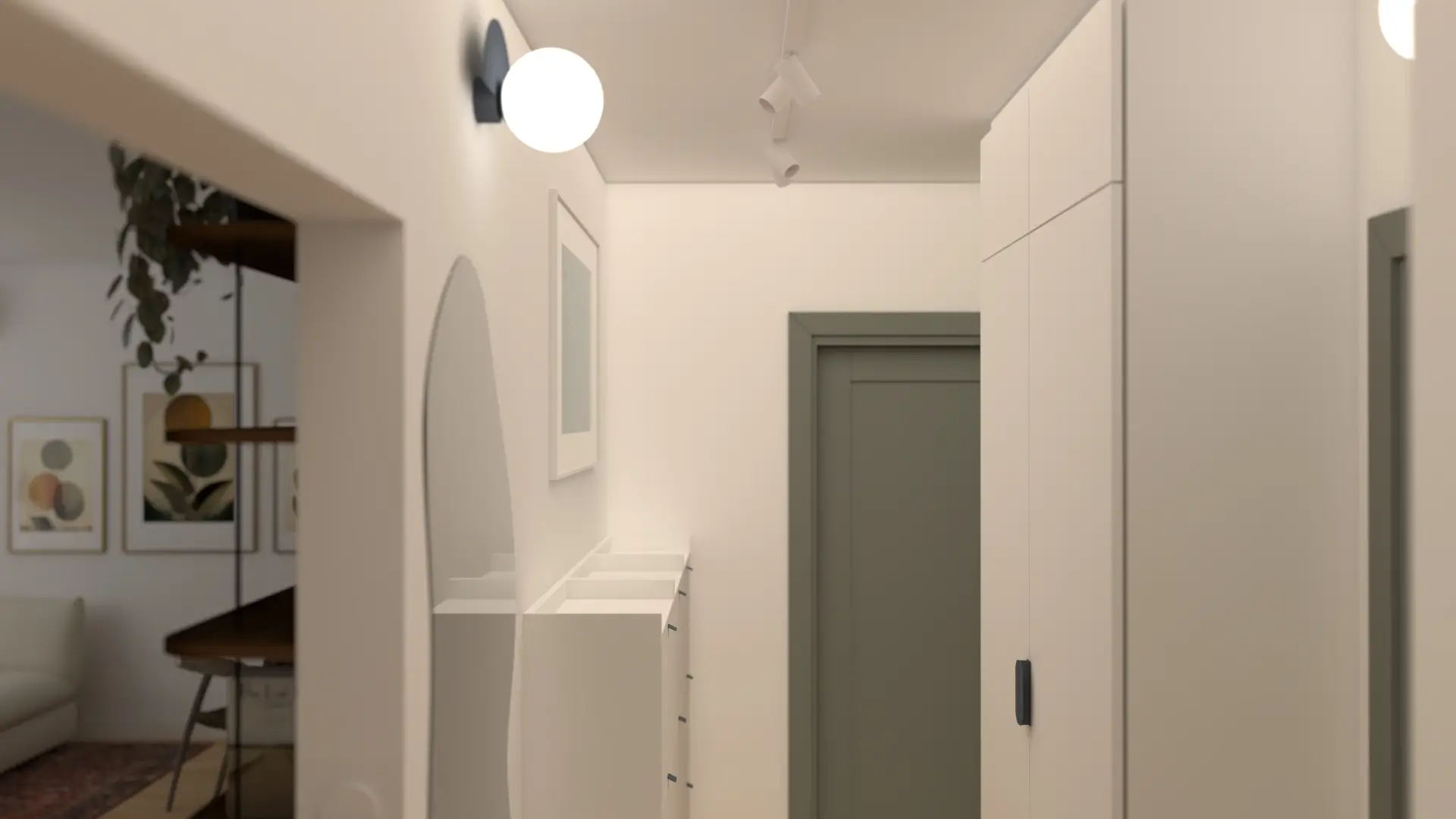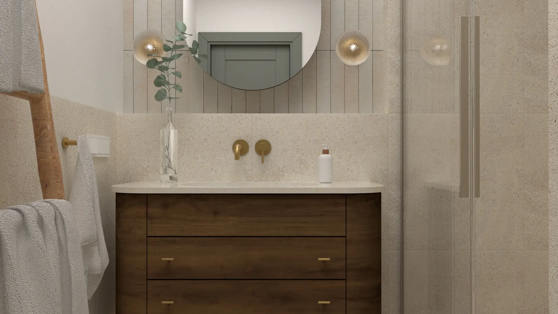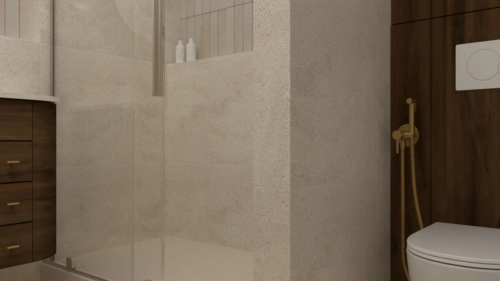 To wnętrze to połączenie stonowanych beży, oliwkowych drzwi i głębokiego orzecha, które razem tworzą harmonijną, przytulną przestrzeń. Prosty układ, miękkie tkaniny i naturalne światło budują domową atmosferę, a detale w kolorze złota nadają całości subtelnego wyrafinowania.