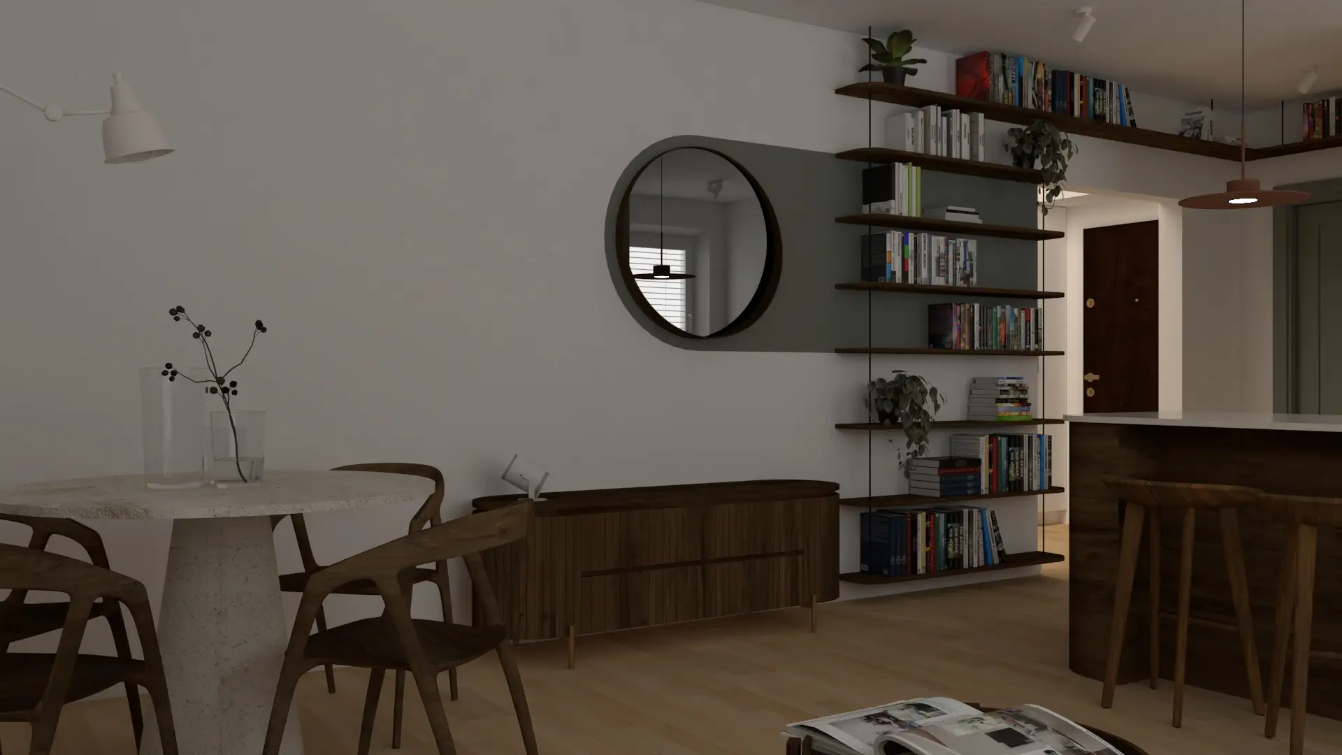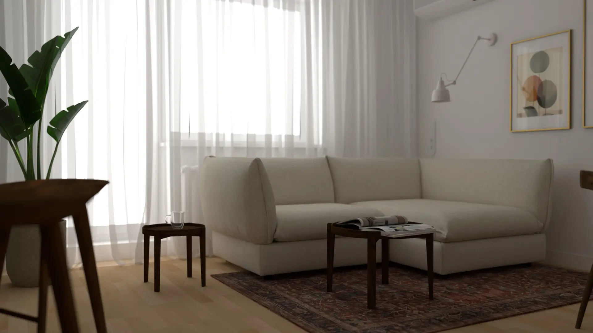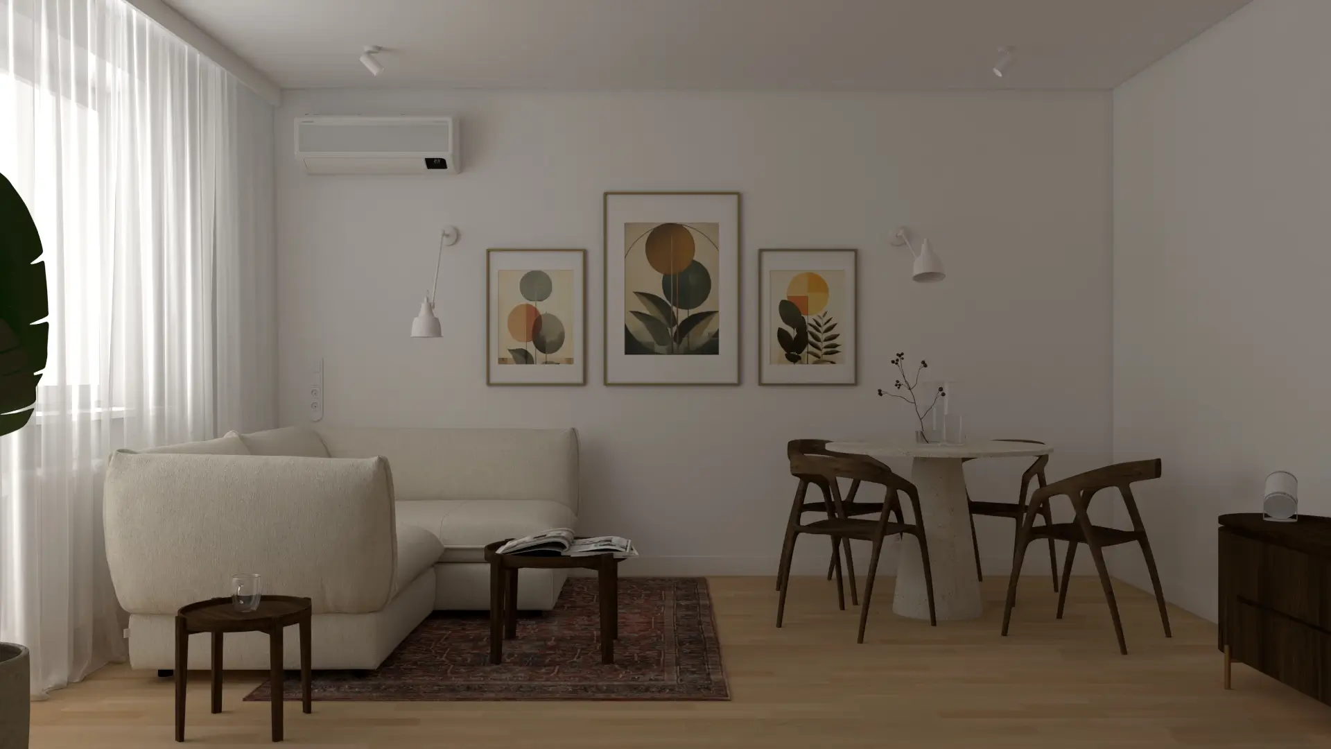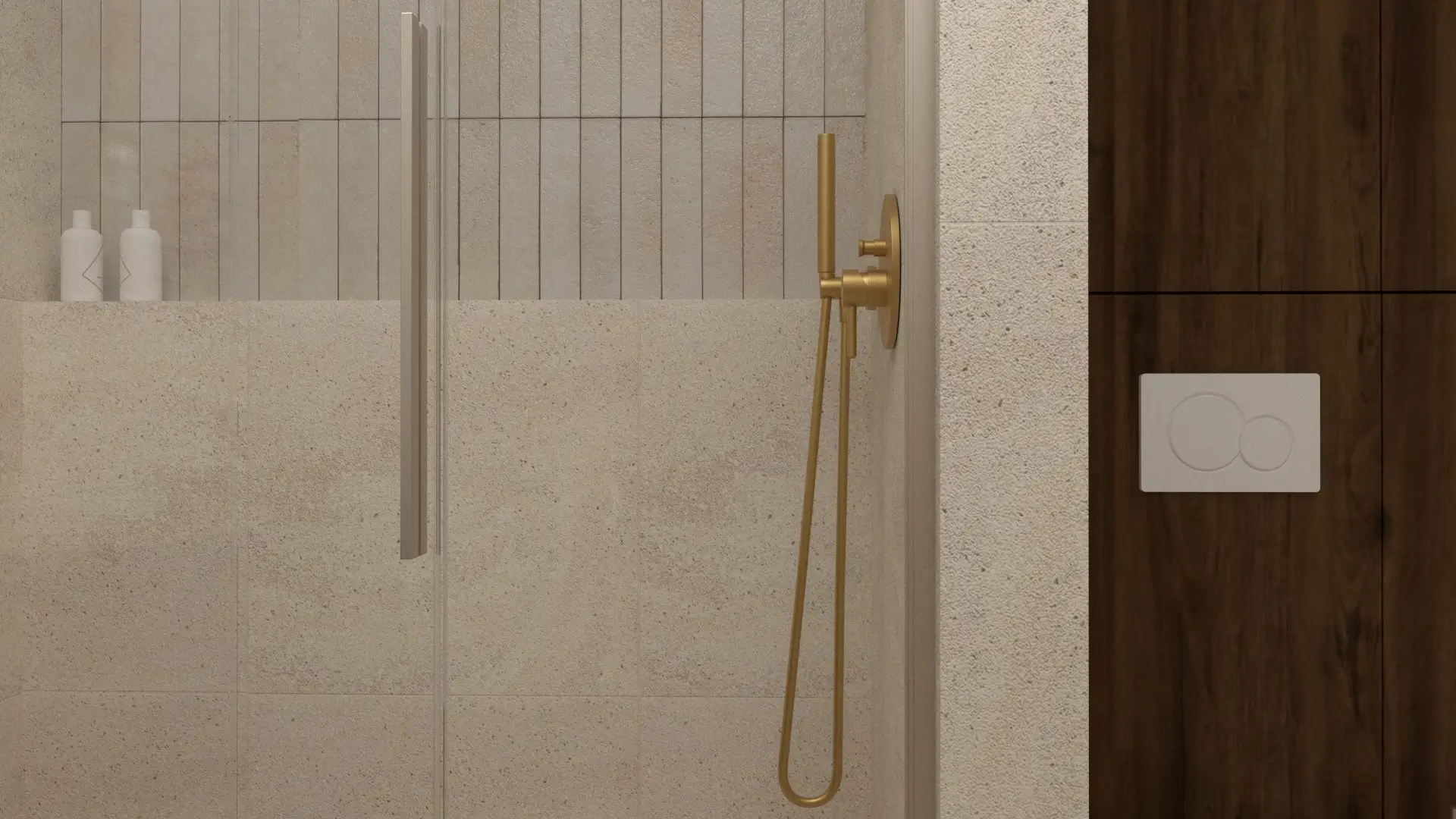 To wnętrze to połączenie stonowanych beży, oliwkowych drzwi i głębokiego orzecha, które razem tworzą harmonijną, przytulną przestrzeń. Prosty układ, miękkie tkaniny i naturalne światło budują domową atmosferę, a detale w kolorze złota nadają całości subtelnego wyrafinowania.