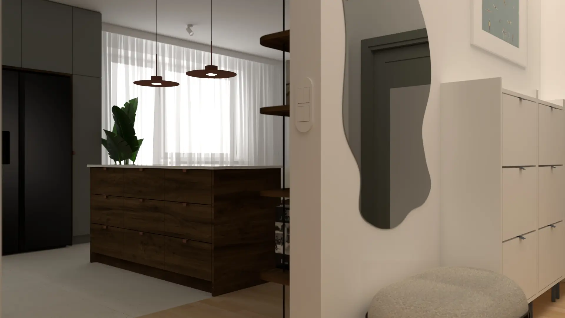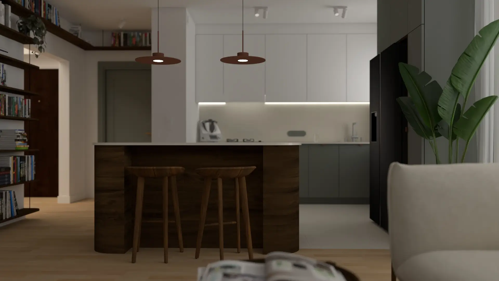 W każdym pomieszczeniu zachowano konsekwencję kolorystyczną i funkcjonalne rozwiązania — od ergonomicznej kuchni, przez jasną strefę dzienną, po spokojną łazienkę z akcentami kamienia.