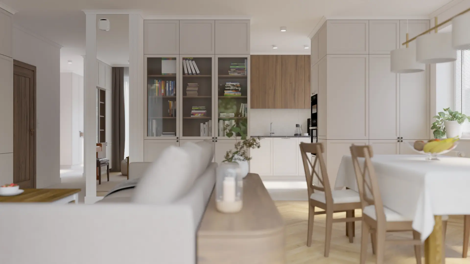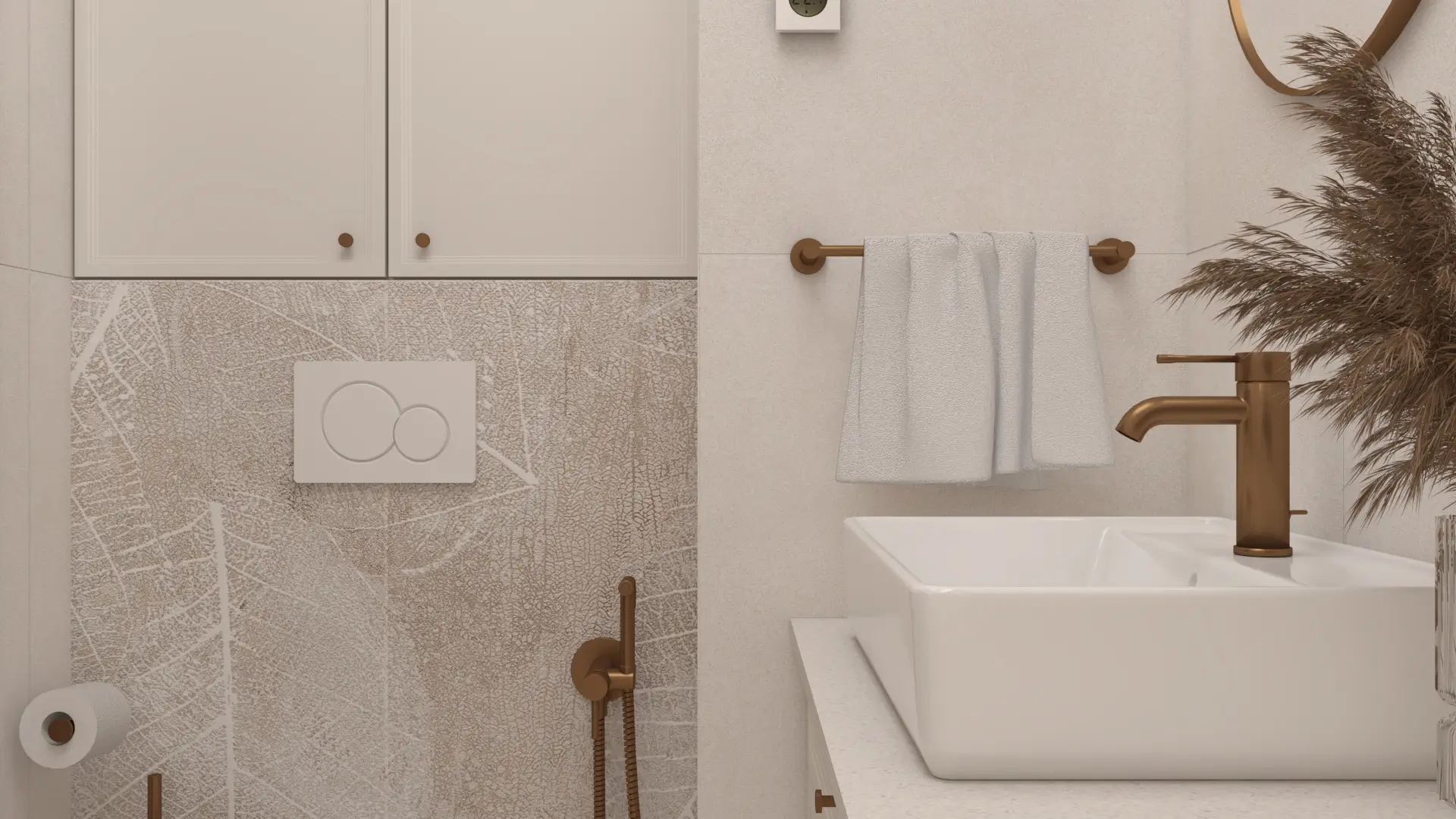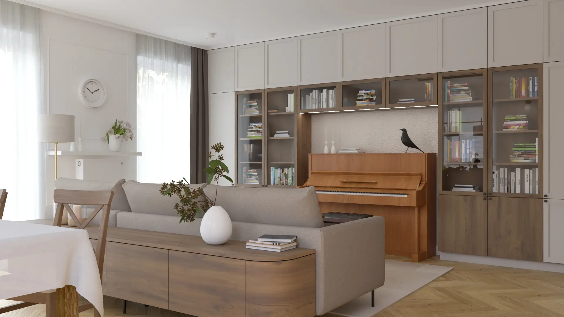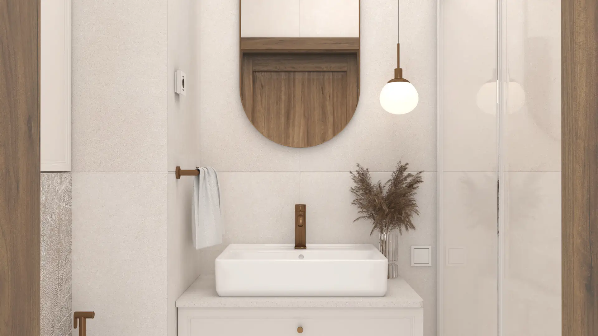 Wnętrze, w którym klasyka spotyka się z nowoczesnością. Połączenie jasnych beży, drewna i akcentów w kolorze miedzi tworzy ciepłą, wyważoną przestrzeń. Naturalne materiały, delikatne oświetlenie i proste formy nadają wnętrzu spokój i harmonię.