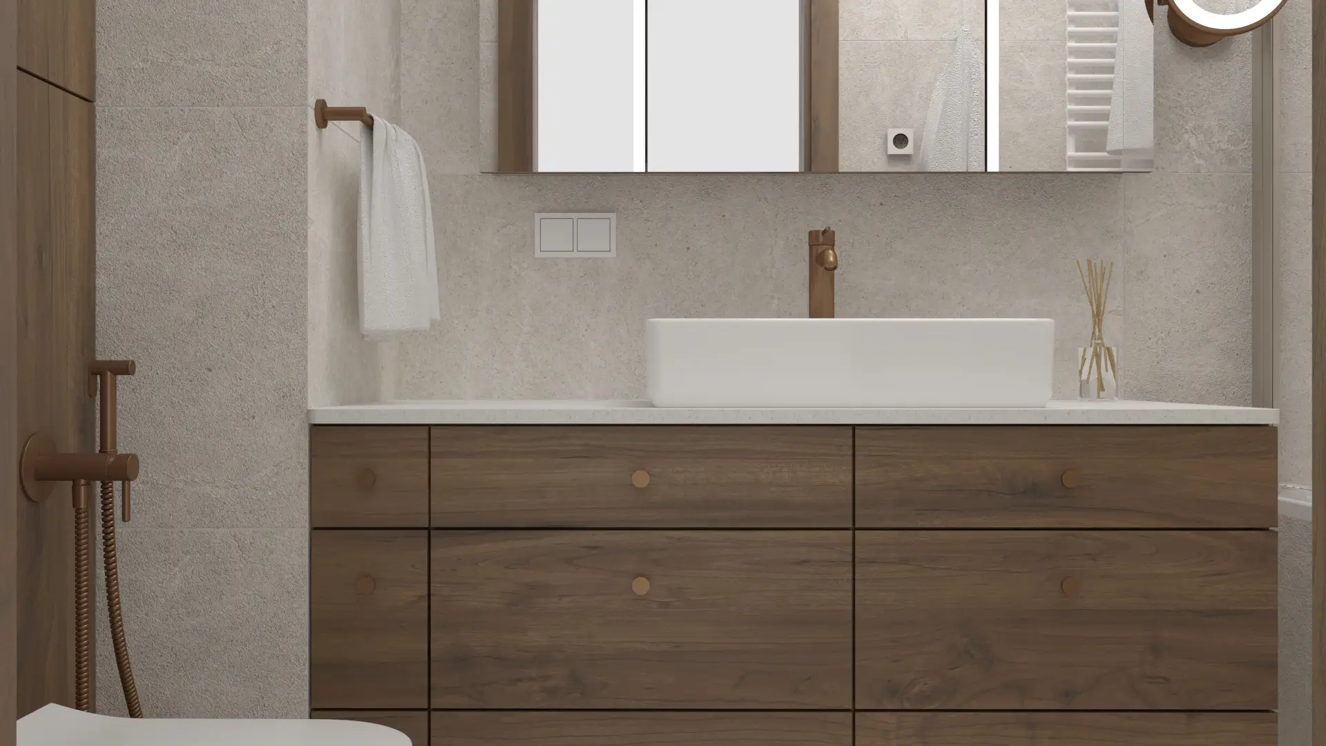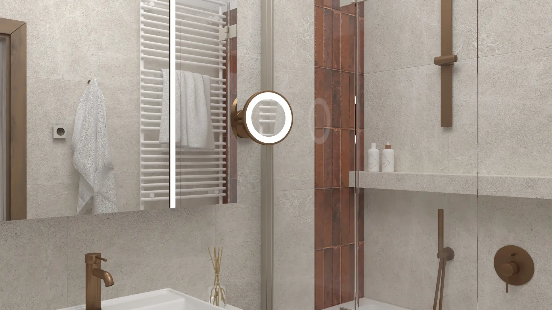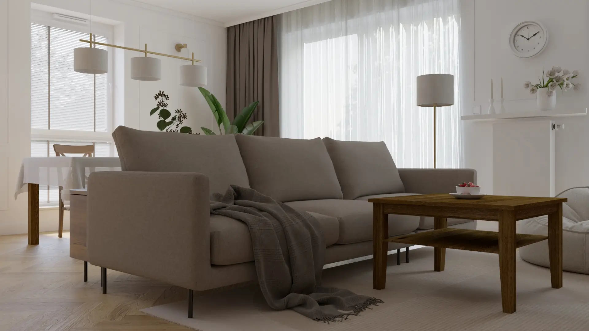 Wnętrze, w którym klasyka spotyka się z nowoczesnością. Połączenie jasnych beży, drewna i akcentów w kolorze miedzi tworzy ciepłą, wyważoną przestrzeń. Naturalne materiały, delikatne oświetlenie i proste formy nadają wnętrzu spokój i harmonię.