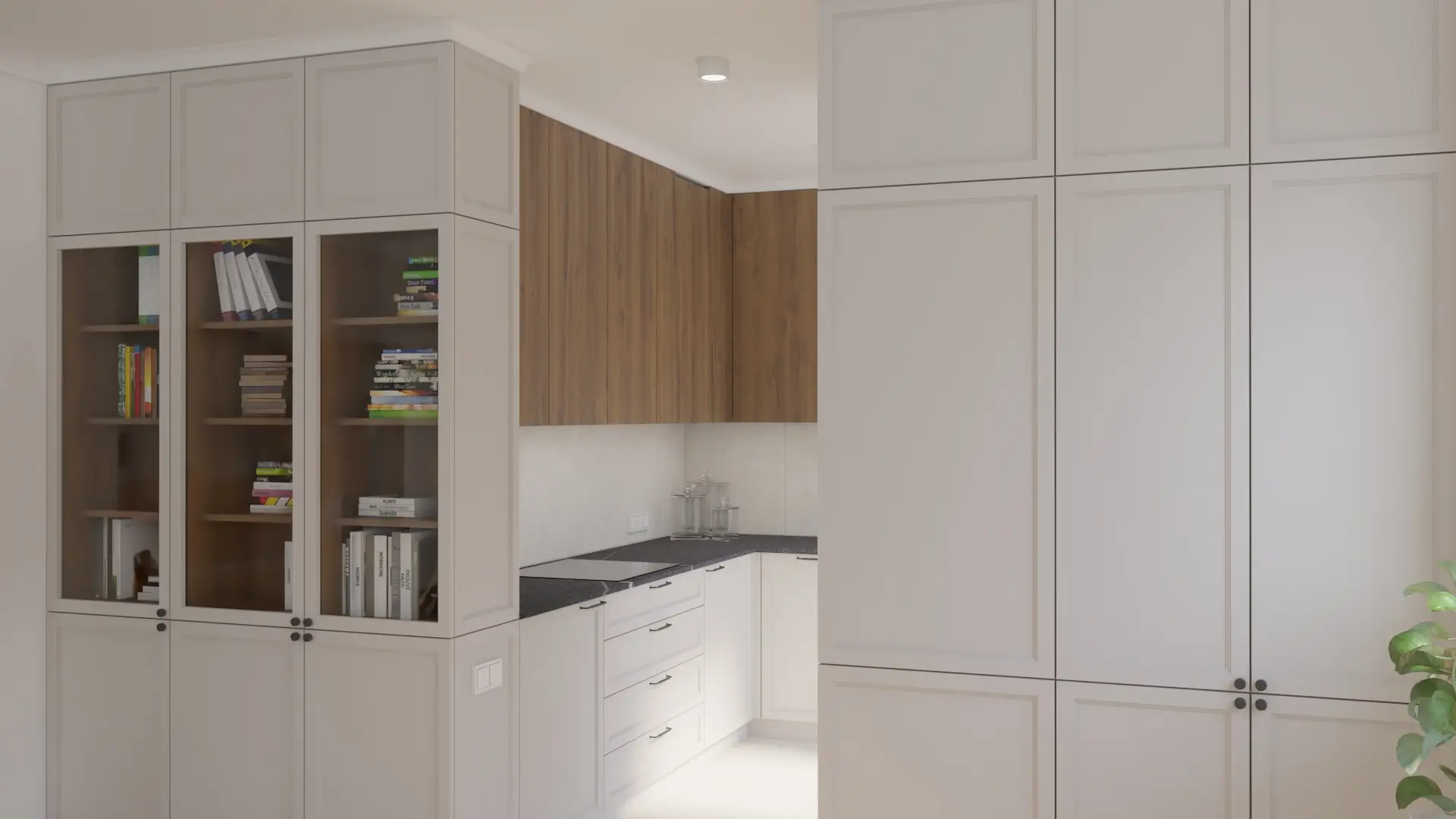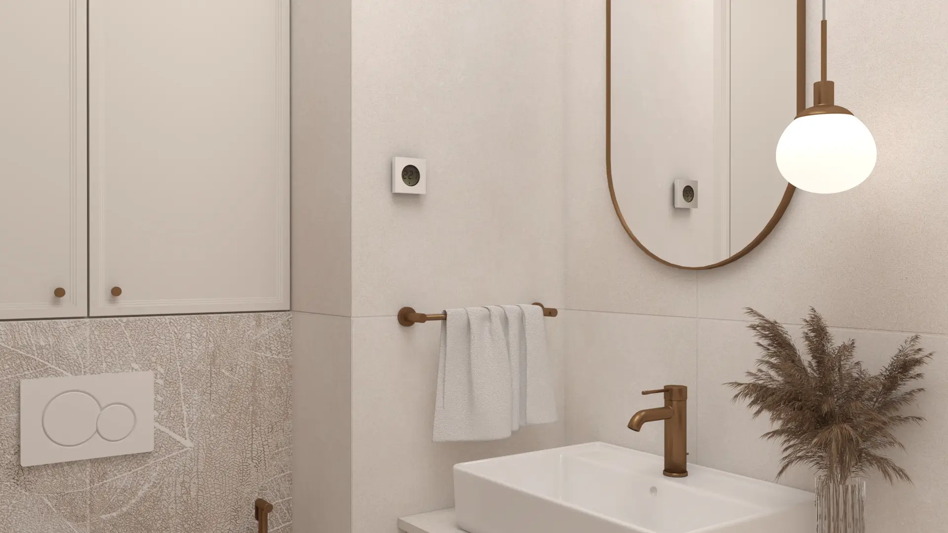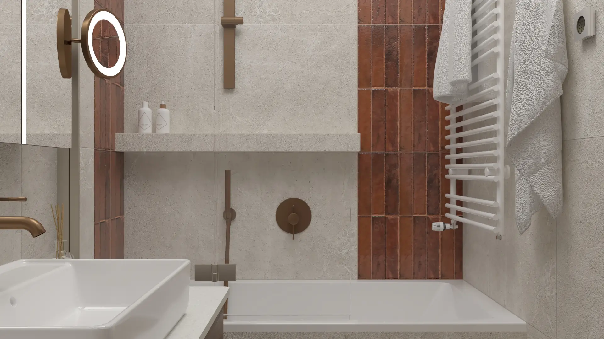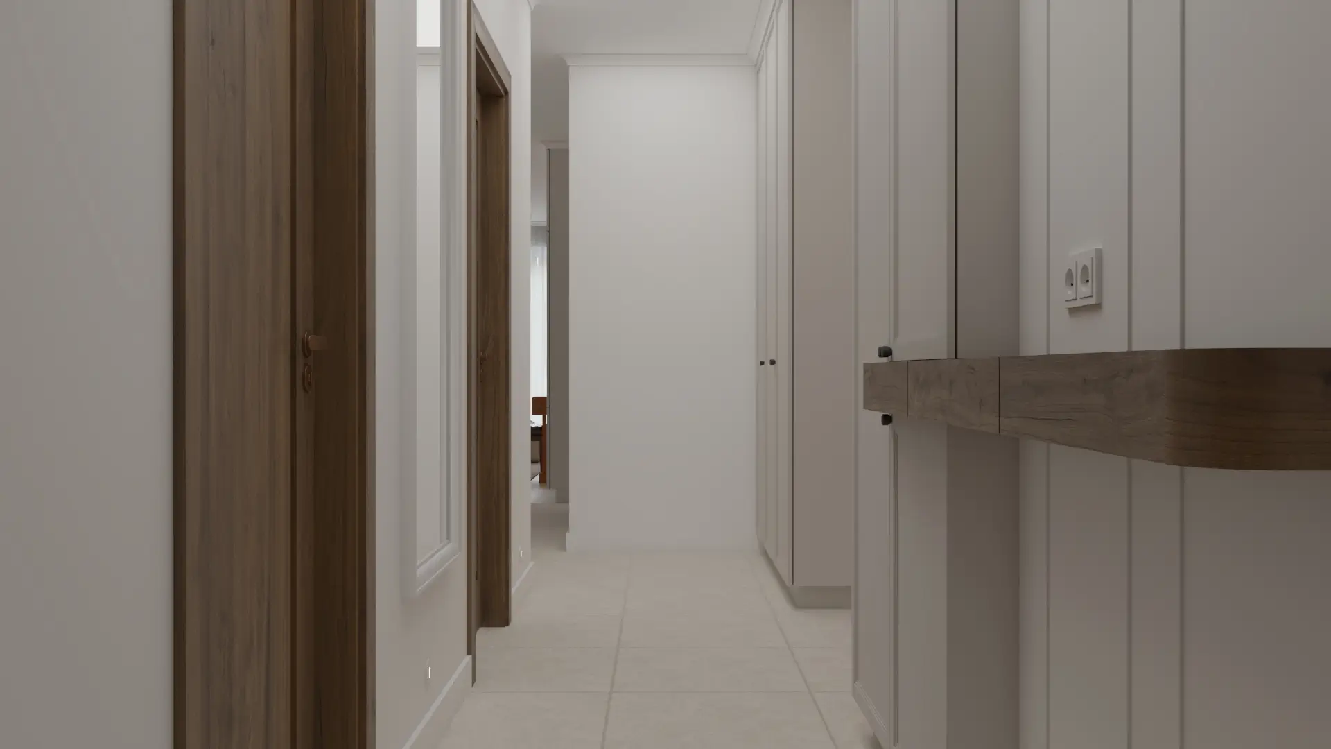 Wnętrze, w którym klasyka spotyka się z nowoczesnością. Połączenie jasnych beży, drewna i akcentów w kolorze miedzi tworzy ciepłą, wyważoną przestrzeń. Naturalne materiały, delikatne oświetlenie i proste formy nadają wnętrzu spokój i harmonię.