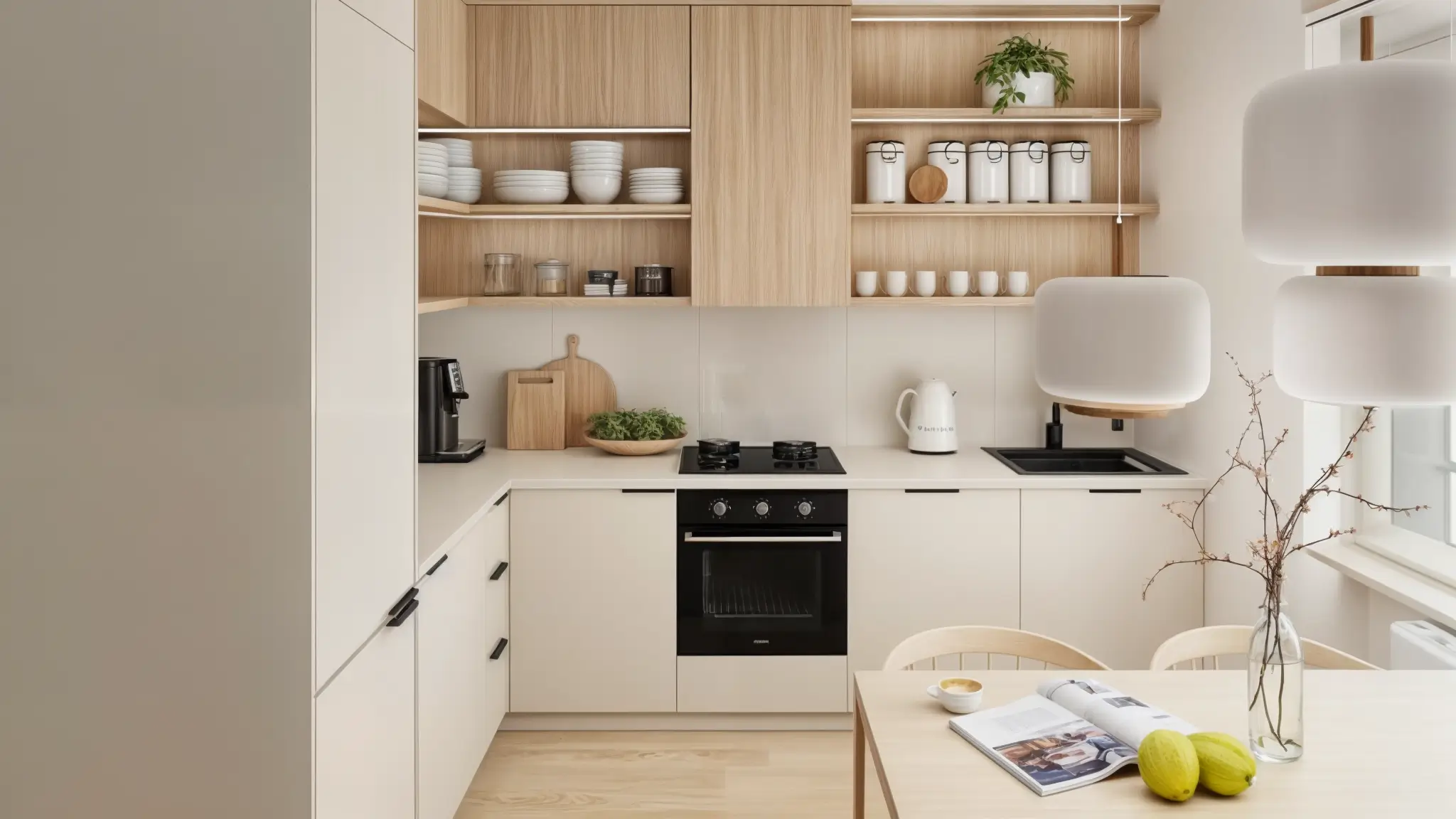 Proste formy i przemyślany układ sprawiają, że mieszkanie jest pełne światła i komfortu — od kuchni z otwartą strefą dzienną po sypialnię w odcieniach beżu i szarości. Każdy element został zaprojektowany tak, by codzienność była spokojna, estetyczna i dobrze zorganizowana.