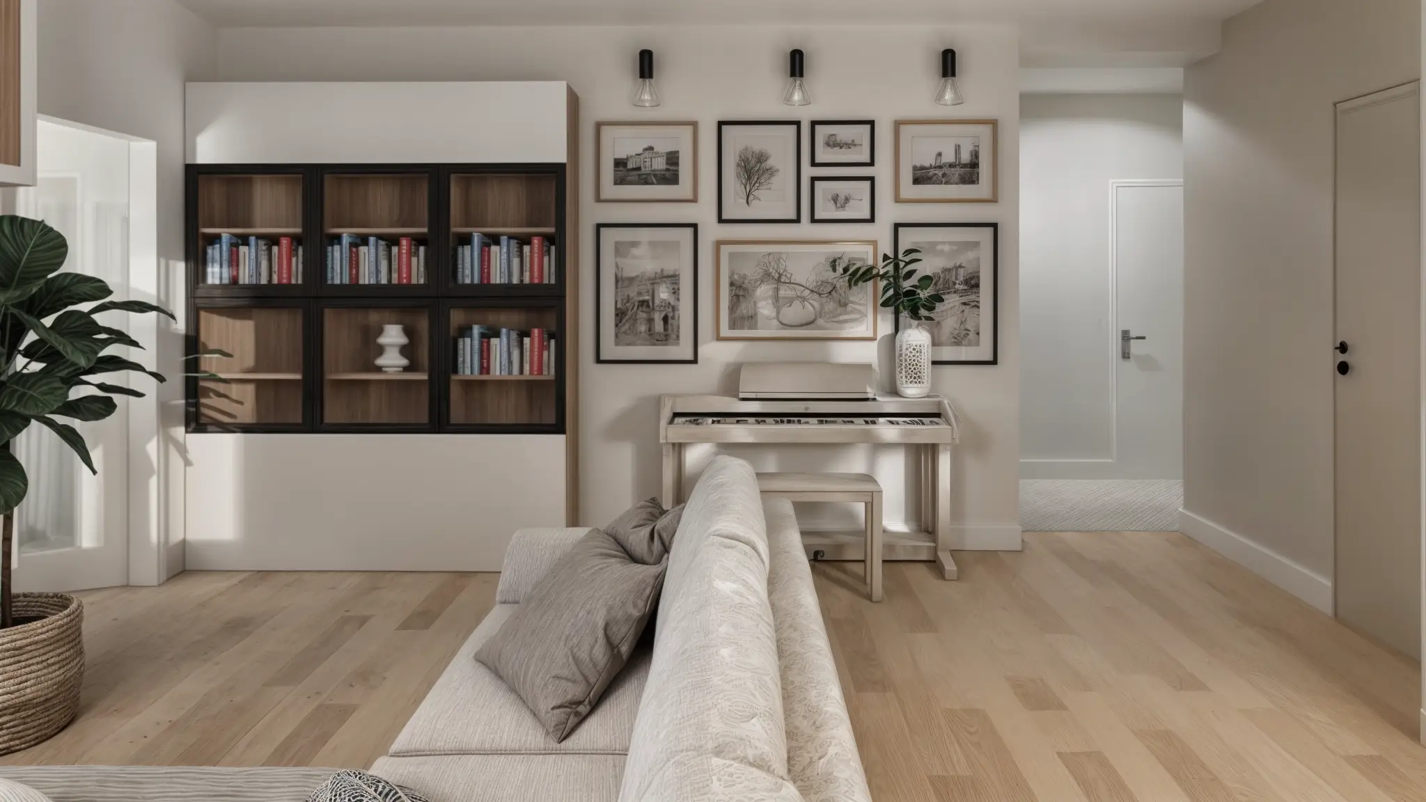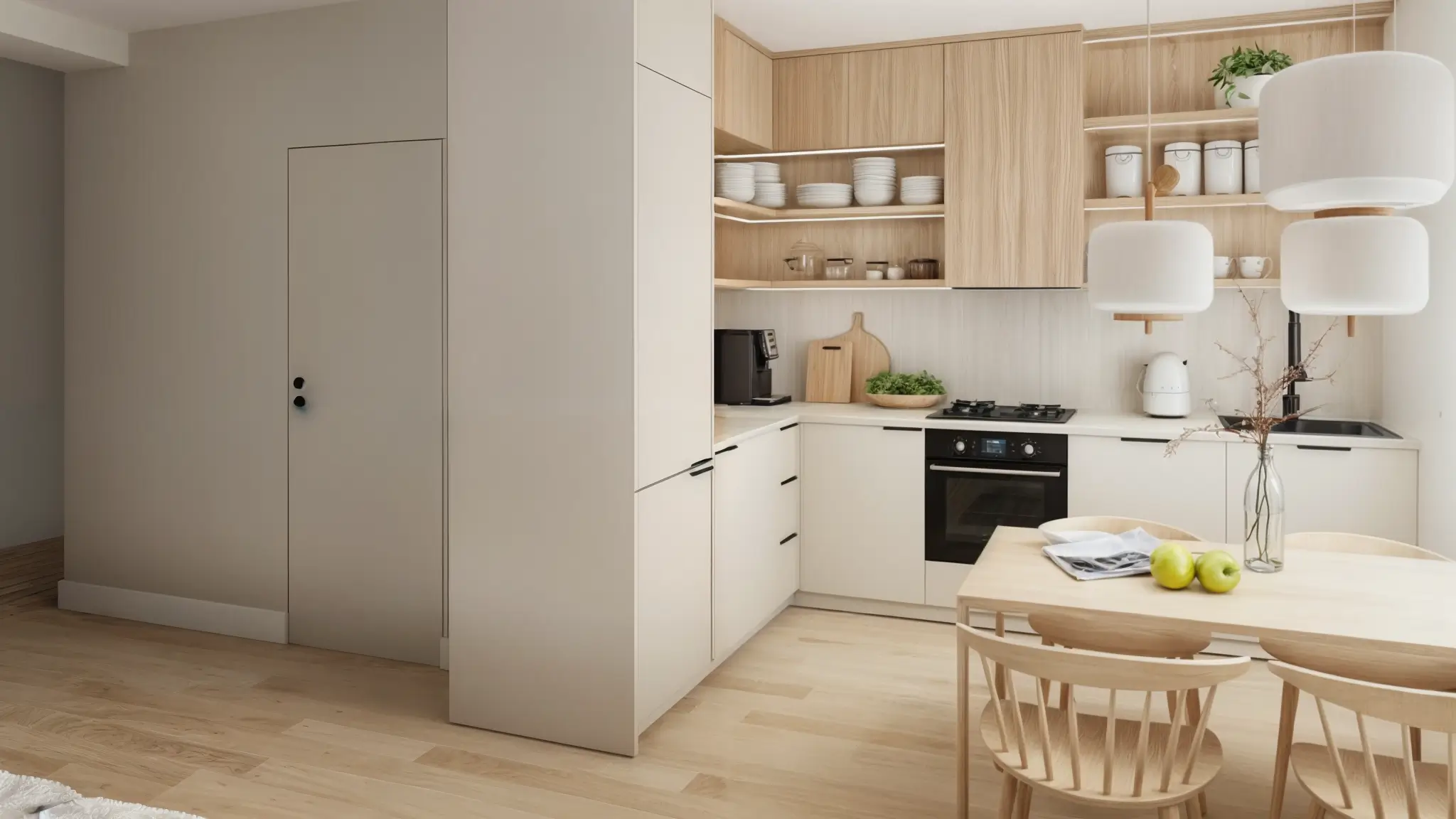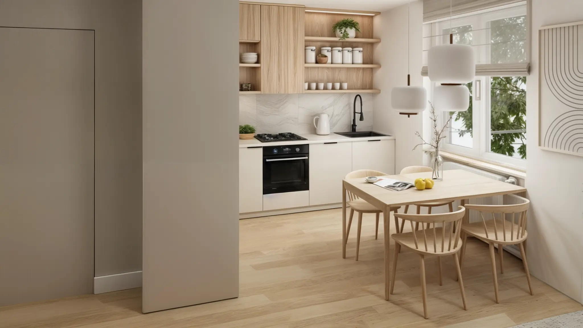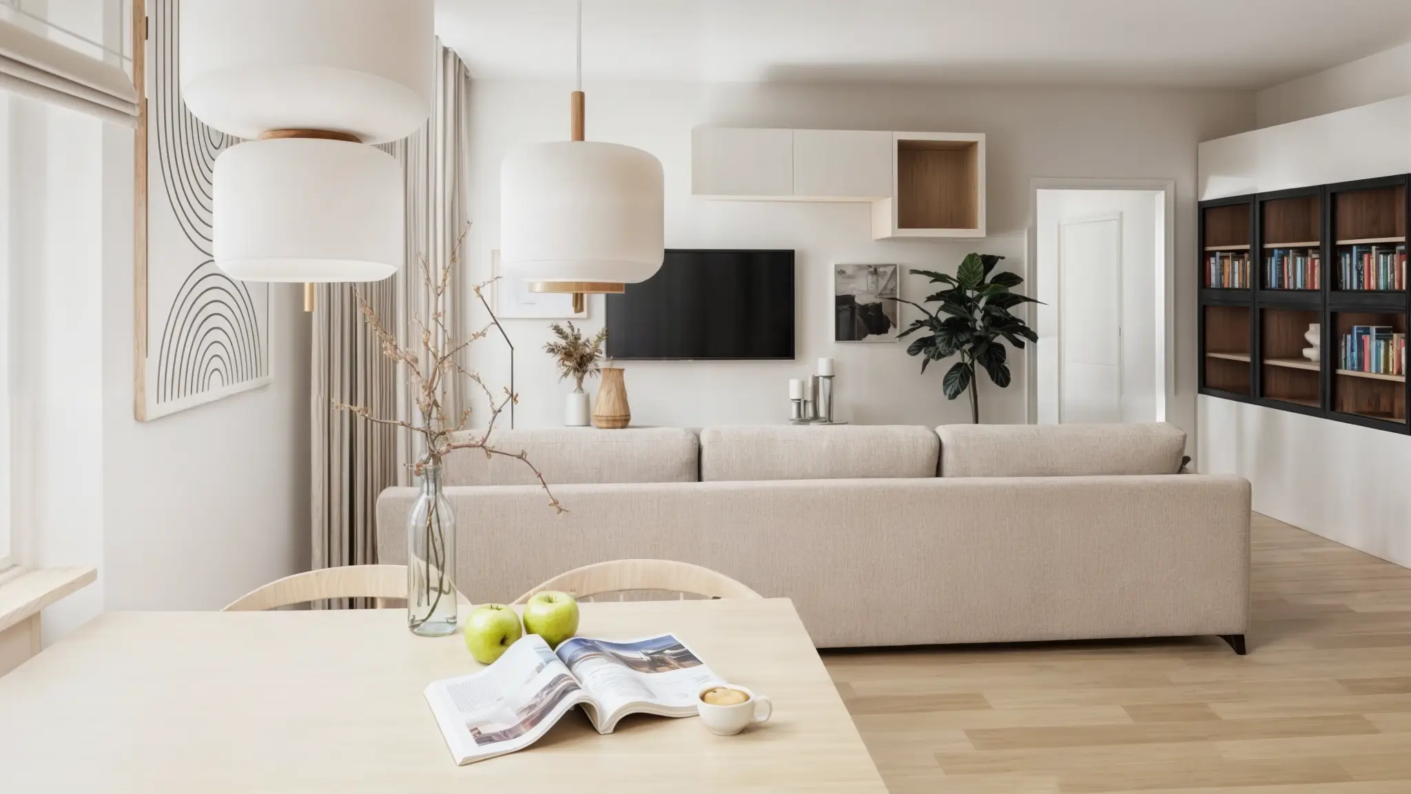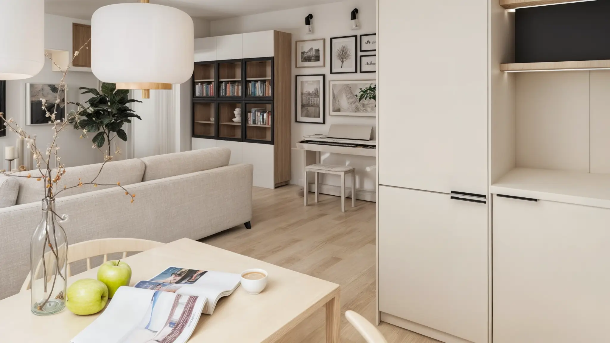 Wnętrze zaprojektowane w duchu minimalizmu i funkcjonalności. Jasne kolory, ciepłe drewno i miękkie tkaniny tworzą przytulną przestrzeń, w której panuje harmonia i lekkość.